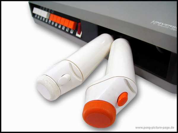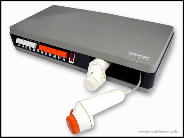 Very nice Pong system by German mailorder company Quelle and sold under their own label Universum. It had it's origin in Italy and was produced for Quelle by an Italian Manufacturer for kitchenware Zanussi. Look at it's great 70ties style design. The system is quite rare but it is almost impossible to find a boxed speciment. The system comes with built-in power supply. Sound comes through the TV-speaker.